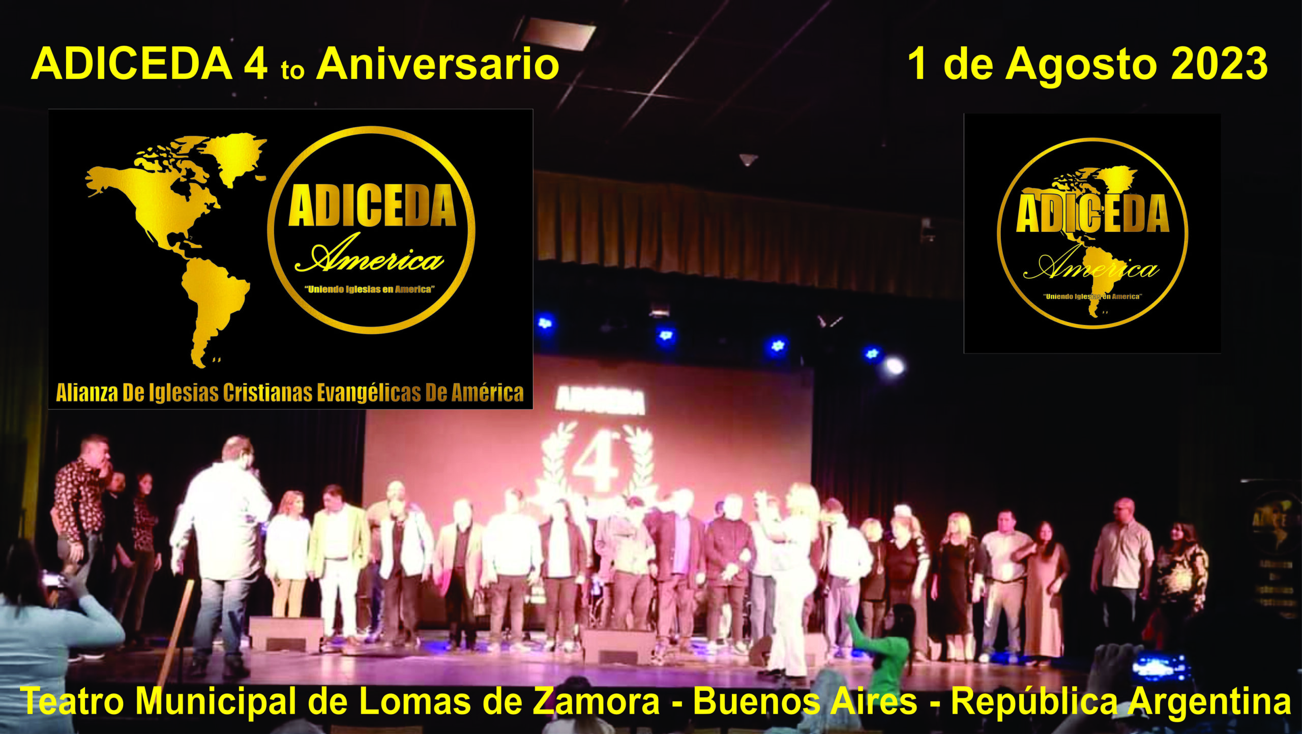La Alianza De Iglesias Cristianas Evangélica De América (ADICEDA) celebro su 4 año de vida y como tiene por costumbre lo hizo con un evento a pura Música Cristiana en el Teatro Municipal de Lomas de Zamora en la Provincia de Buenos Aires, Republica Argentina, al igual que el año anterior con la presencia de Pastores, Apóstoles, Predicadores, evangelistas, Maestro y Ministros que forman parte de ADICEDA se realizo en evento el Martes 1 de Agosto a las 17 hs.