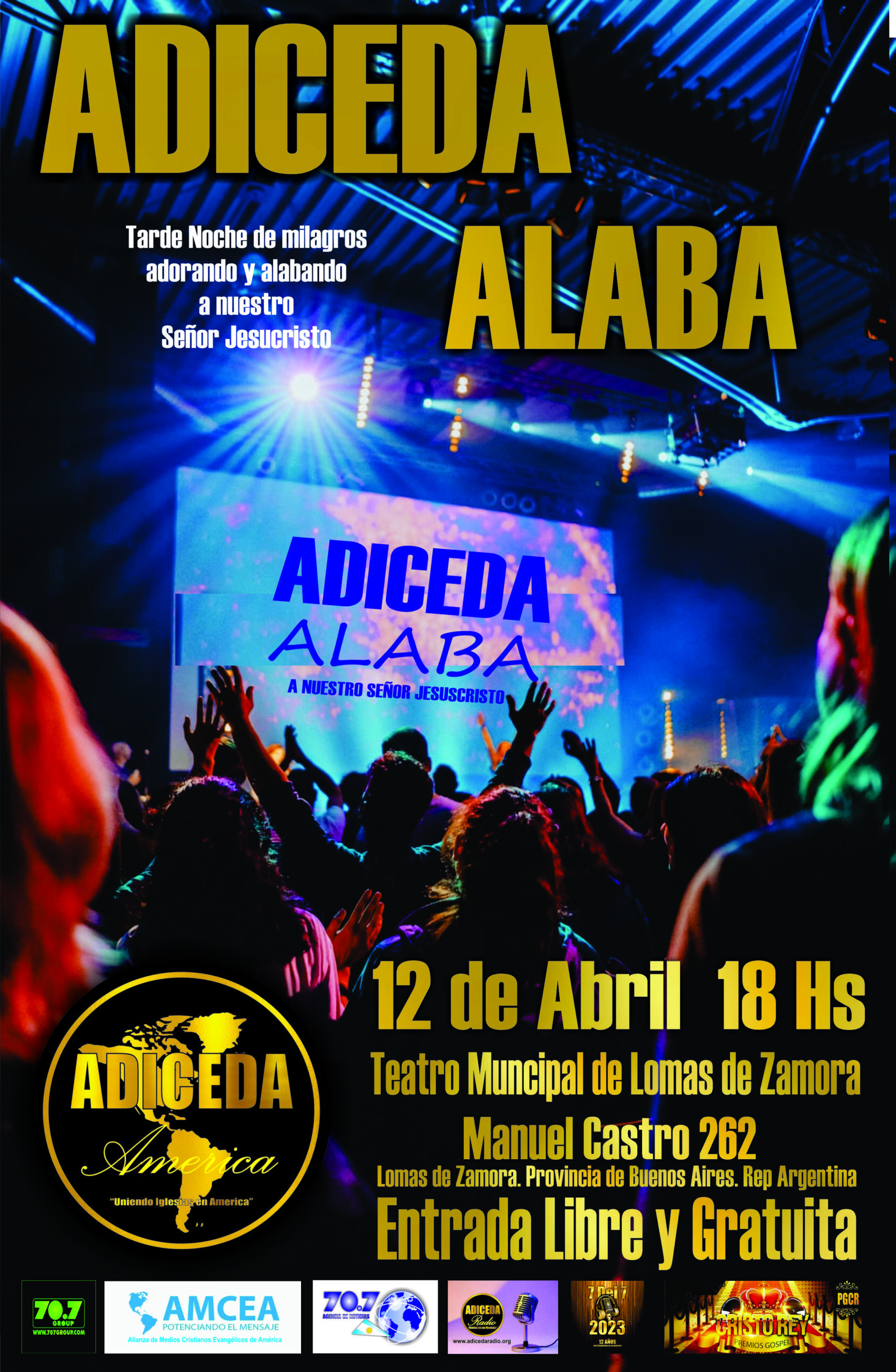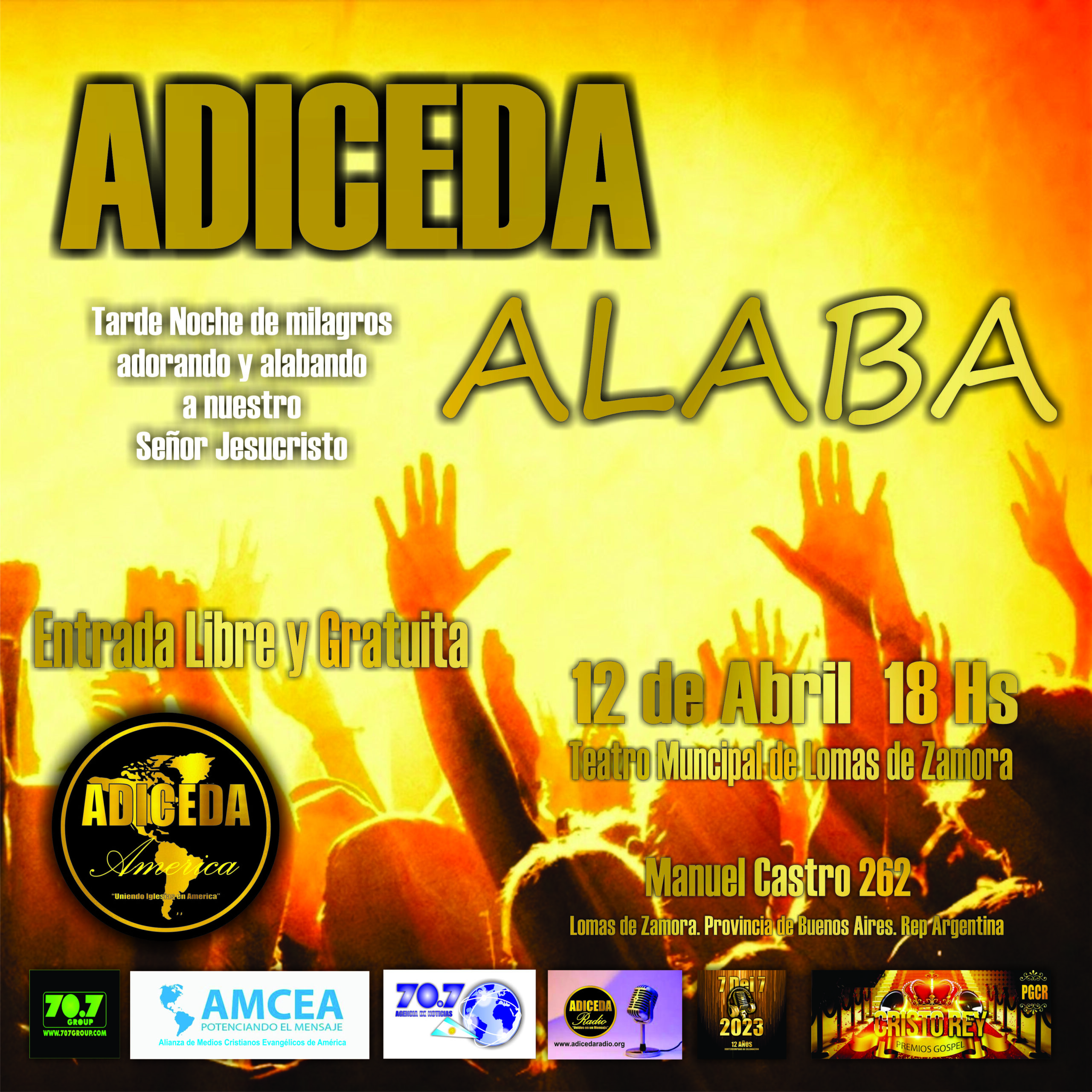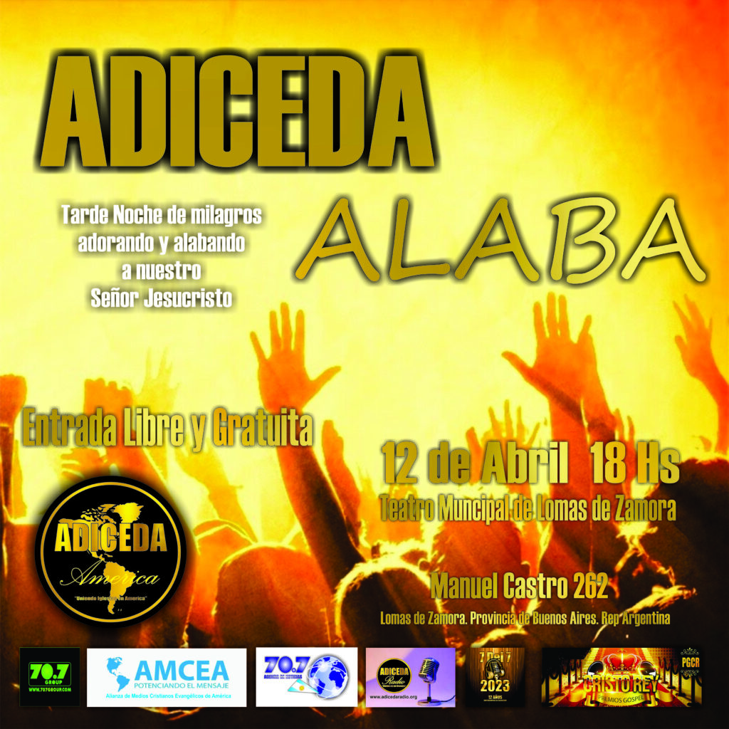 ADICEDA te Invita y Los espera a todos este 12 de Abril a las 18 Hs en el 1er encuentro de alabanza y Adoración de la Alianza De Iglesias Cristianas Evangélicas De América, ADICEDA ALABA en el teatro Municipal de Lomas de Zamora. Manuel Castro 262. Lomas de Zamora. Provincia de Buenos Aires. República Argentina. con Entrada libre y gratuita.