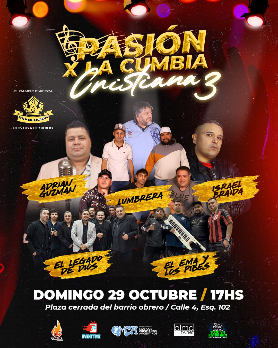 y grupos de Danzas, entrada libre y gratuita, bandas en vivo testimonios de vida y un mensaje de Dios para tu vida, lugar en plaza cerrada de barrio obrero, calle 4 esq. calle 102.